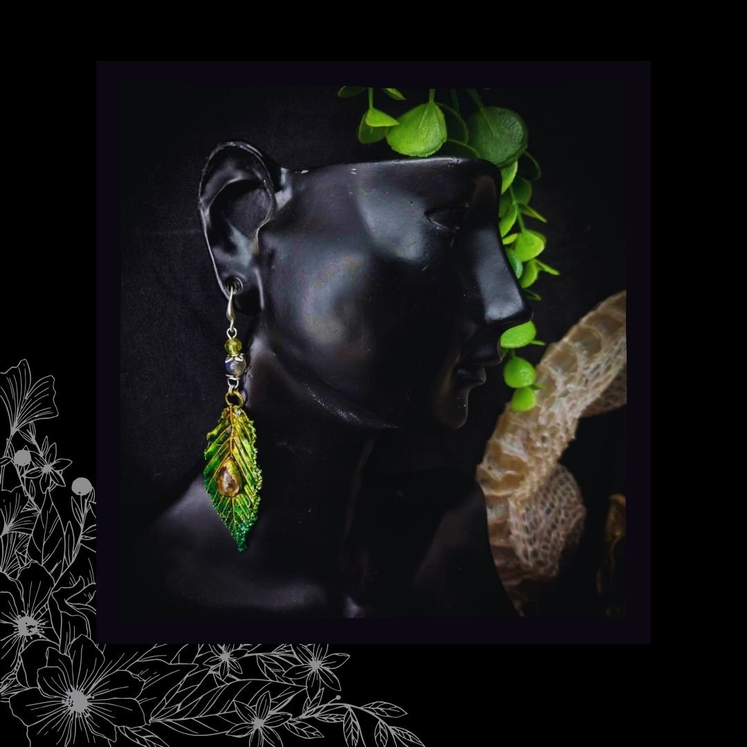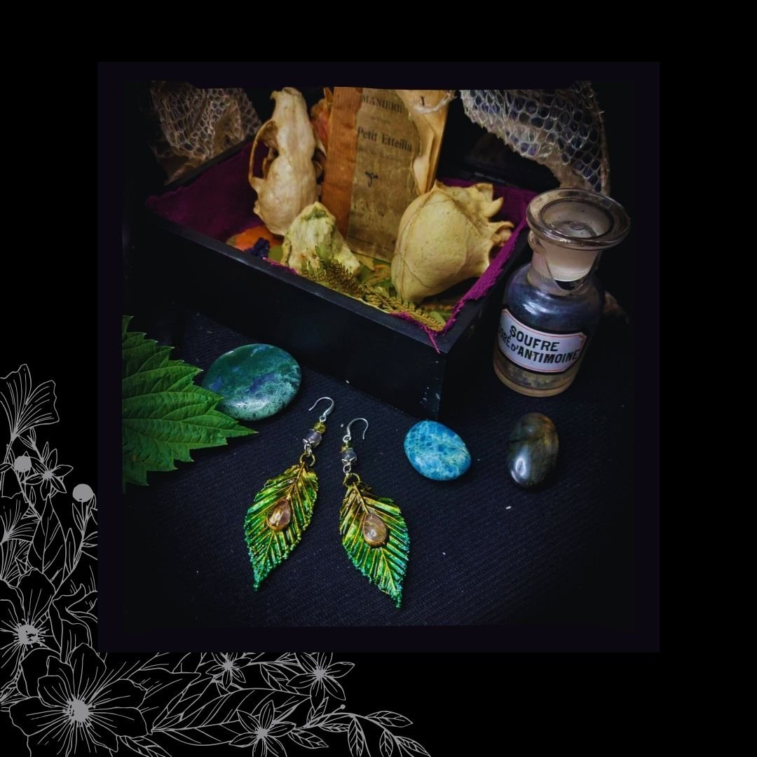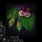 Boucles d'oreilles feuilles serties de Quartz Rutile et embellies de perles en pierres fines, montées sur crochets en argent 925.