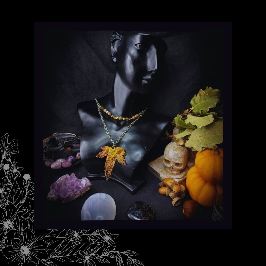 Collier à double rang mélangeant feuille et pierres. Il est doté d'un fermoir mousqueton et d'une chaînette de réglage.